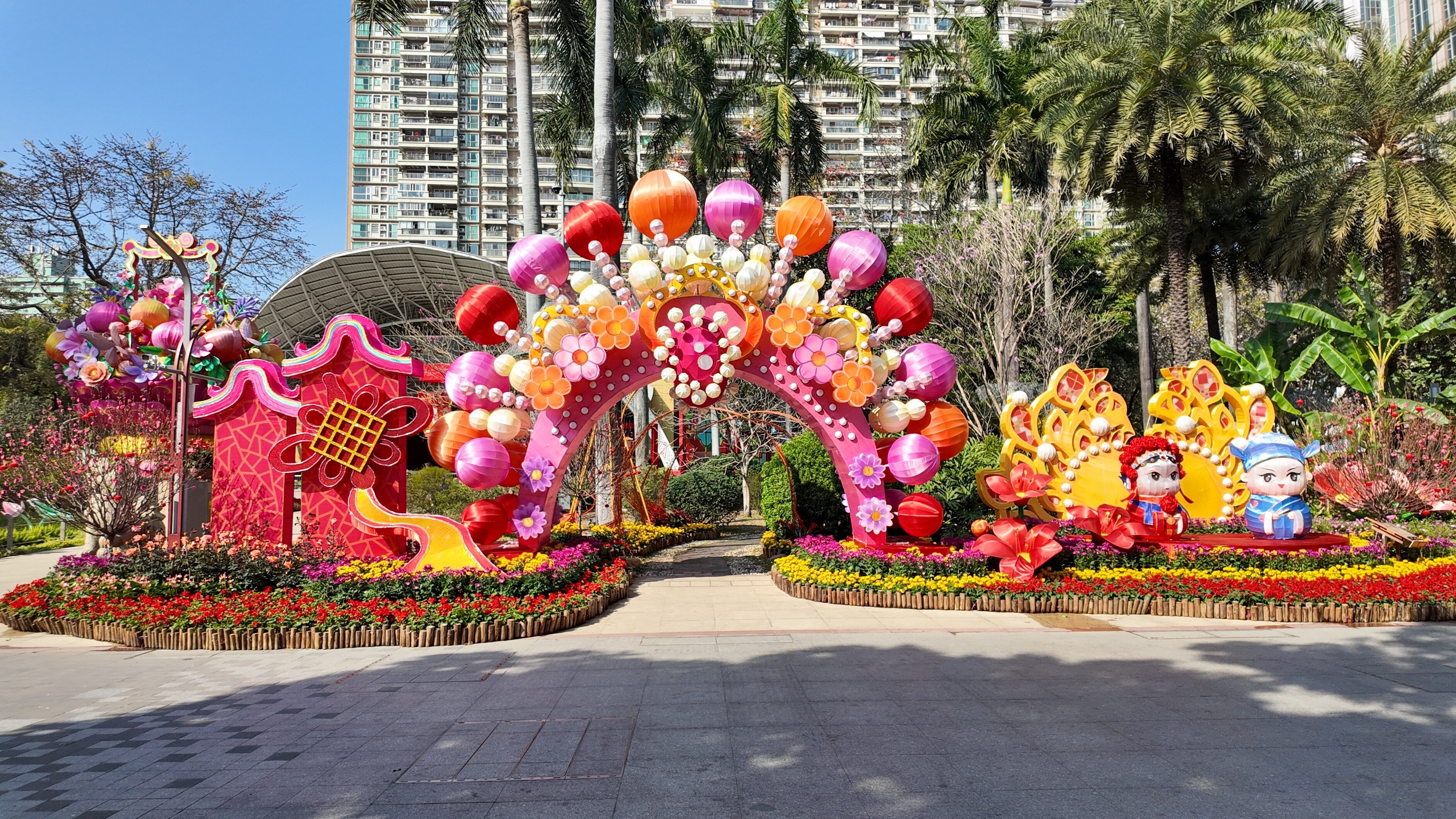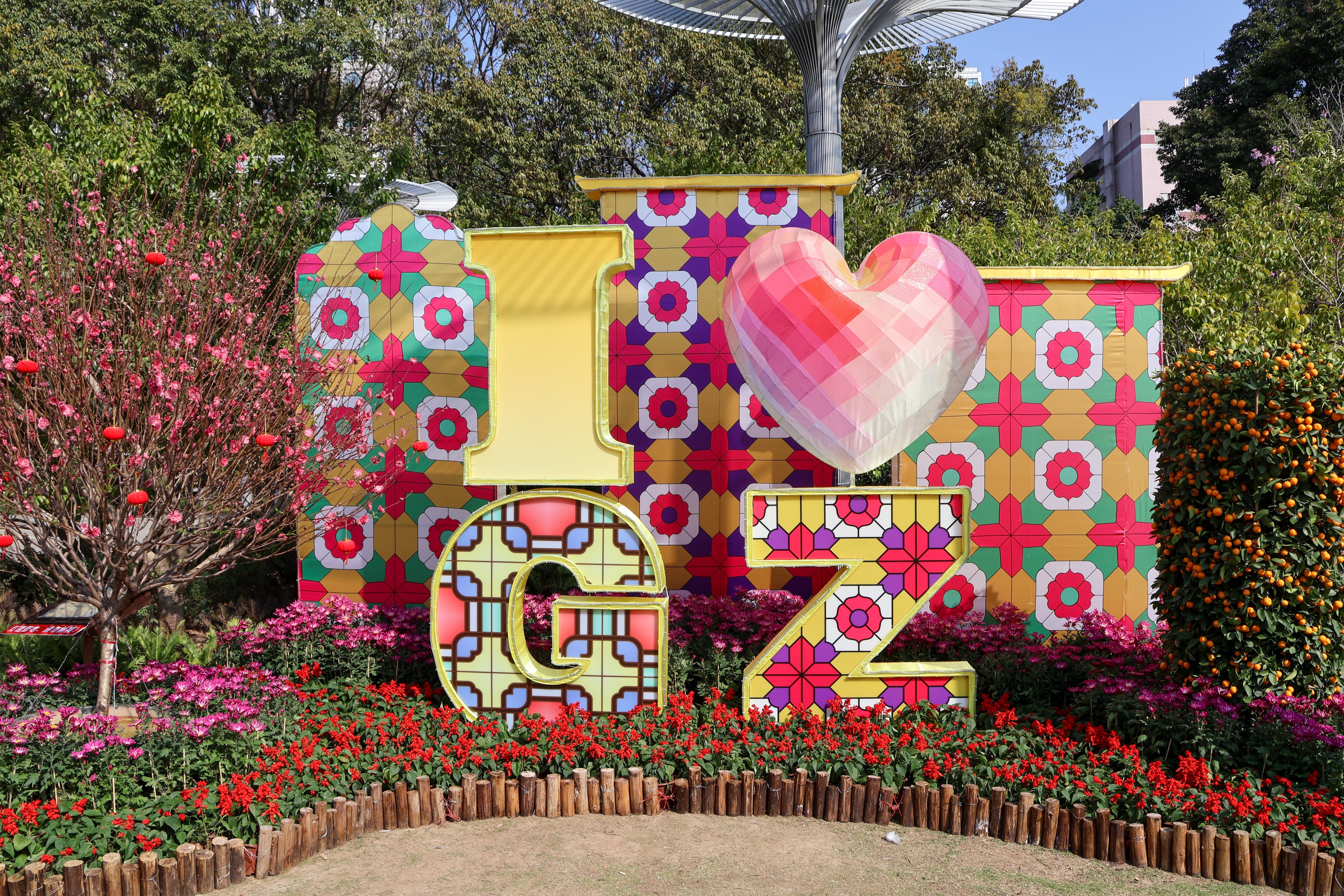 广府匠心,新春景组浓缩岭南文化。花会各景组匠心独运,将中国传统吉祥喜庆的文化元素与园林布置技艺相融合,在正门中轴线到中心广场区域以及各出入口打造了一系列富含岭南特色和年味浓郁的园林景组。