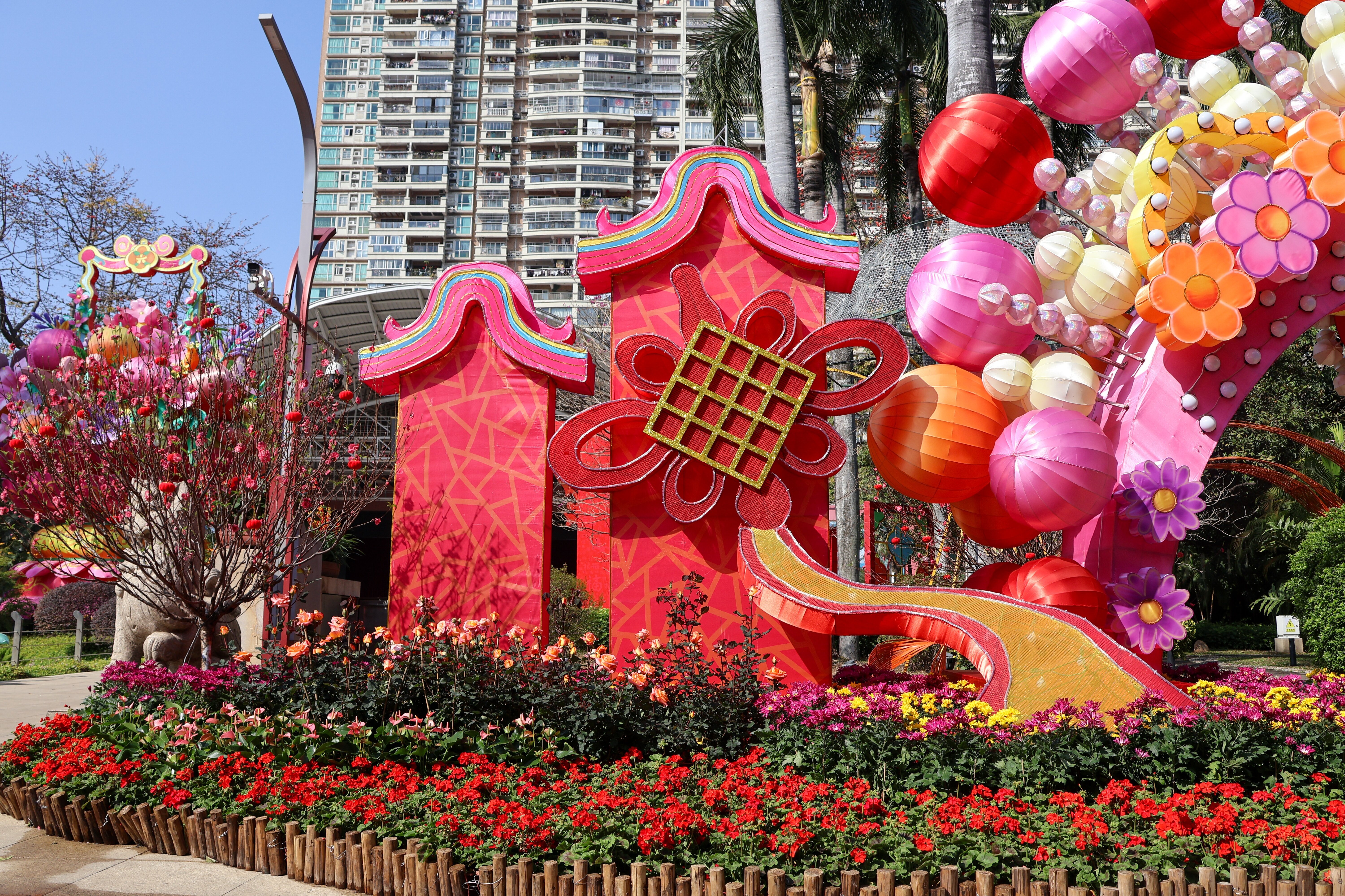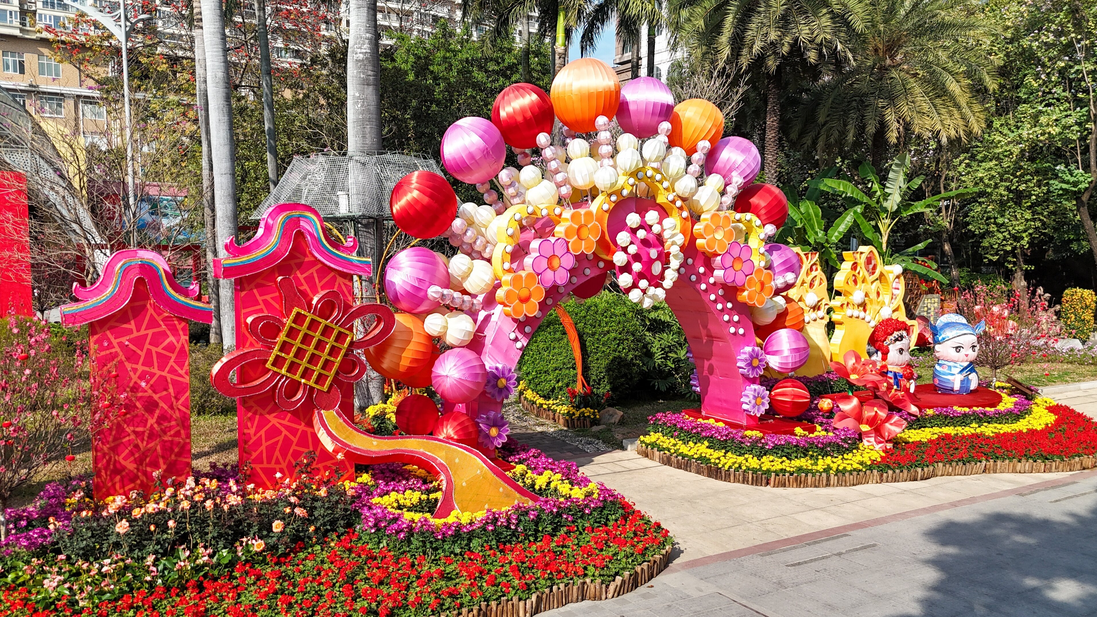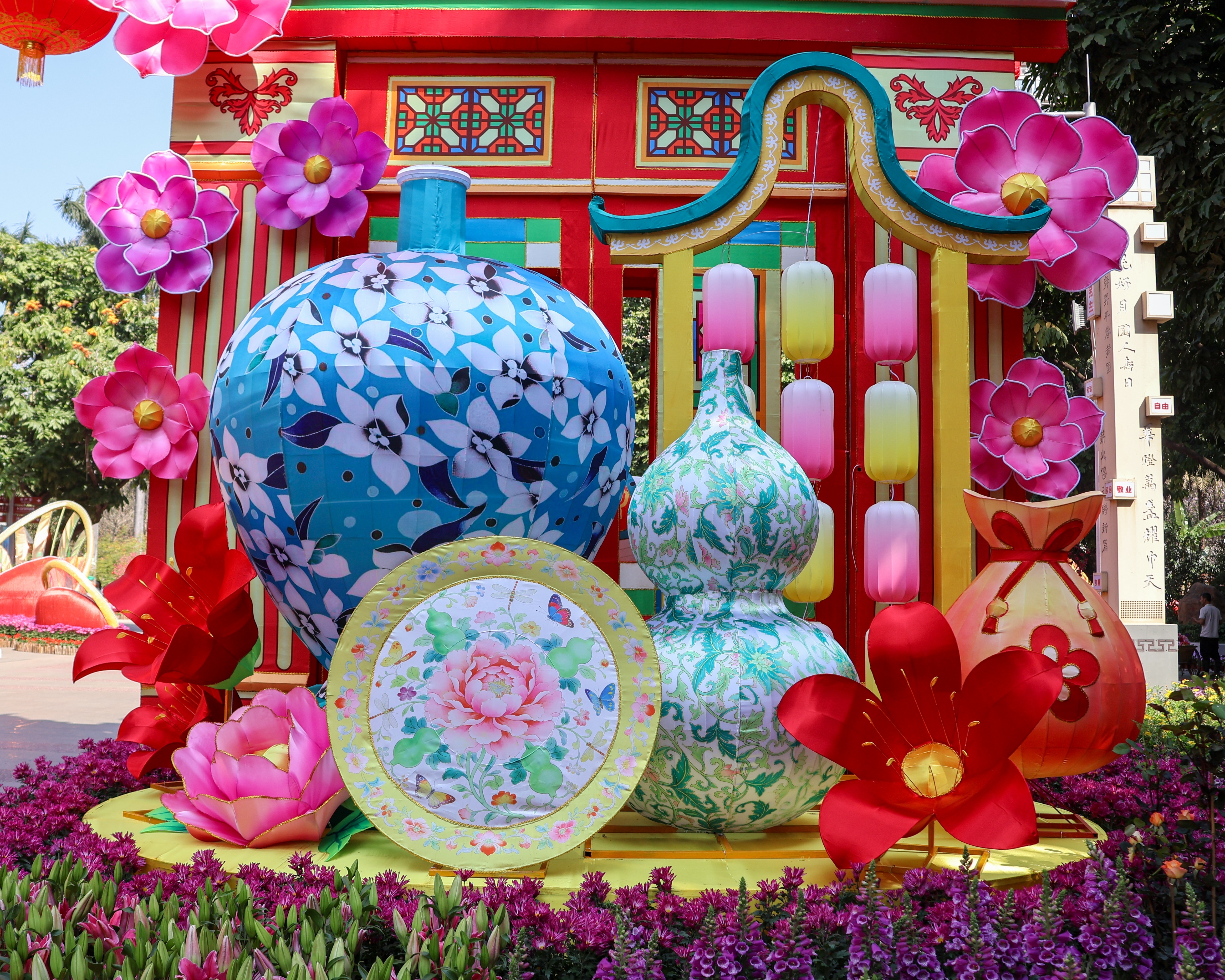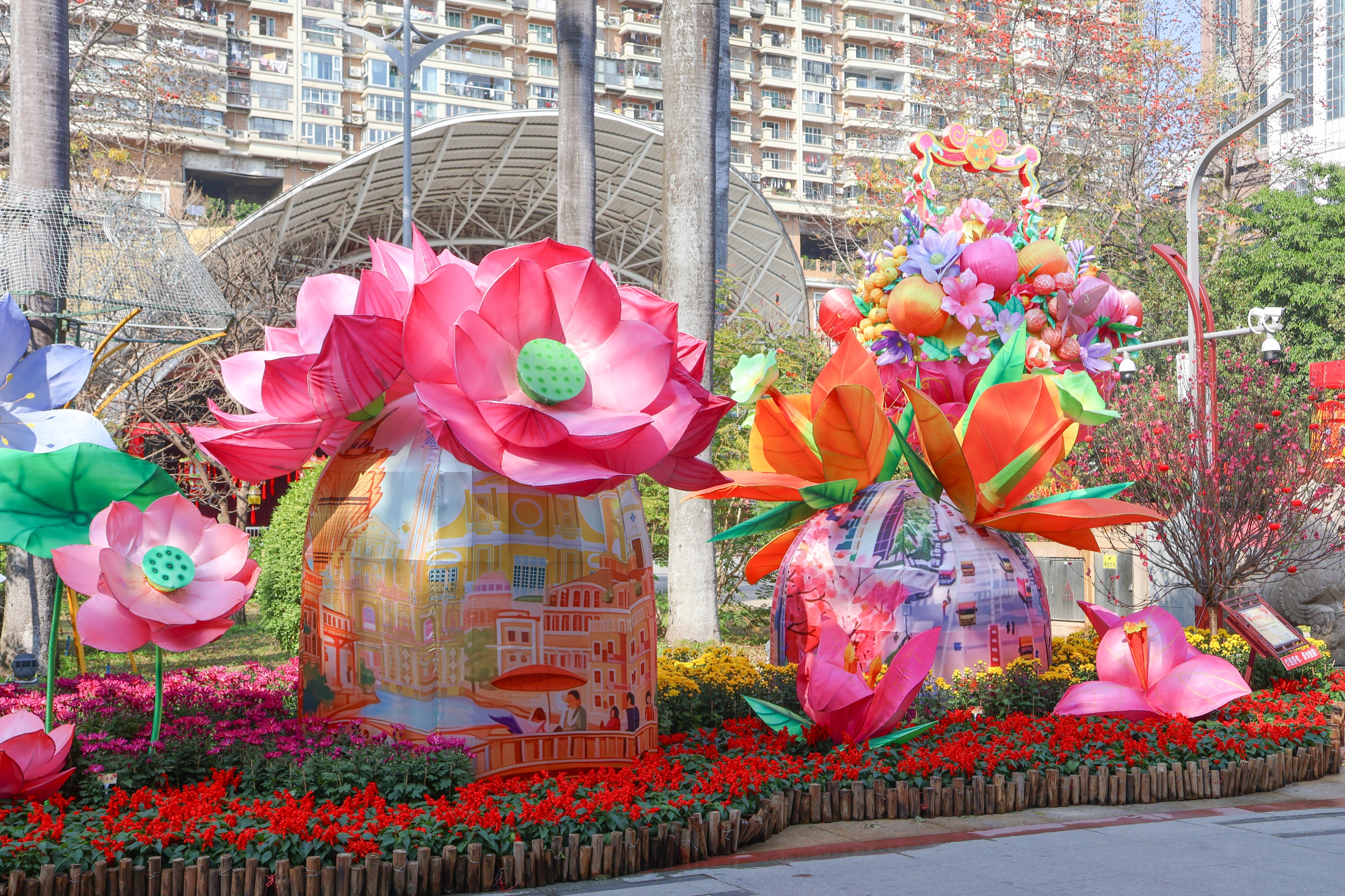 这些植物被巧妙地融入花灯景组之中,花色与灯影交相辉映,为新春的景致增添了浓郁的喜庆氛围。
