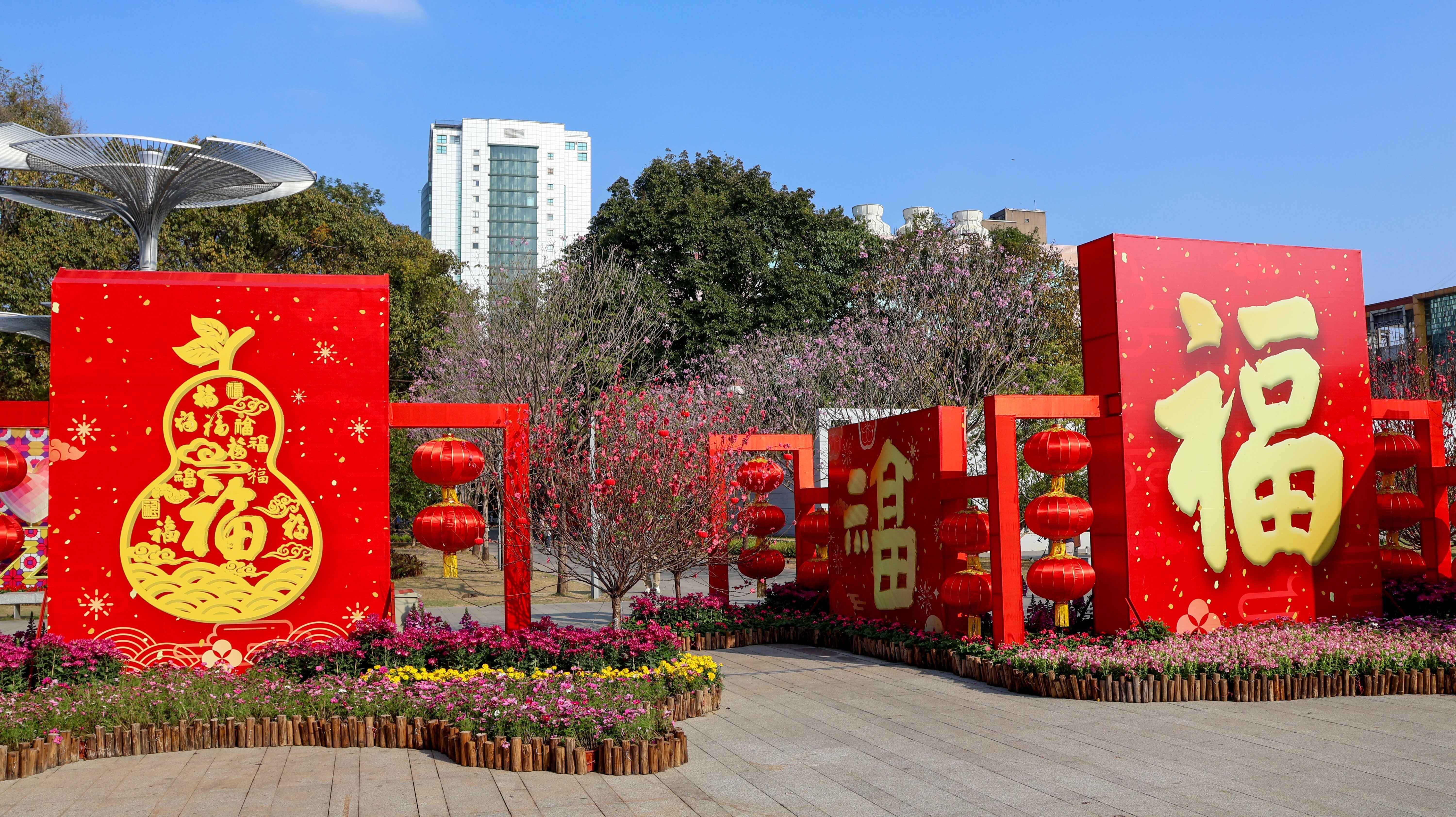 马跃春风,传统元素点燃节庆欢腾。西南广场“马跃福至”主题景组以书法五福、新年吉语演绎岭南年味。景组以名家的手写“五福”为核心,将“福”字这个最质朴的愿望变得触手可及,让市民游客在合影打卡时,就能把“五福临门”的好意头“框”回家。