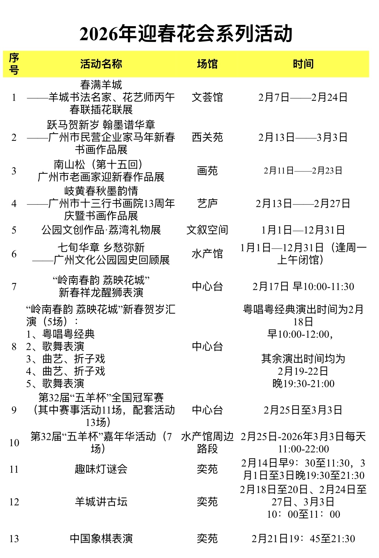 广州文化公园2026年迎春花会以“岭南春韵 荔映花城”为主题,展出时间为2026年2月16日(除夕)至3月3日(正月十五),其中元宵灯会亮灯时间为2月25日(正月初九)至3月3日(正月十五)晚。