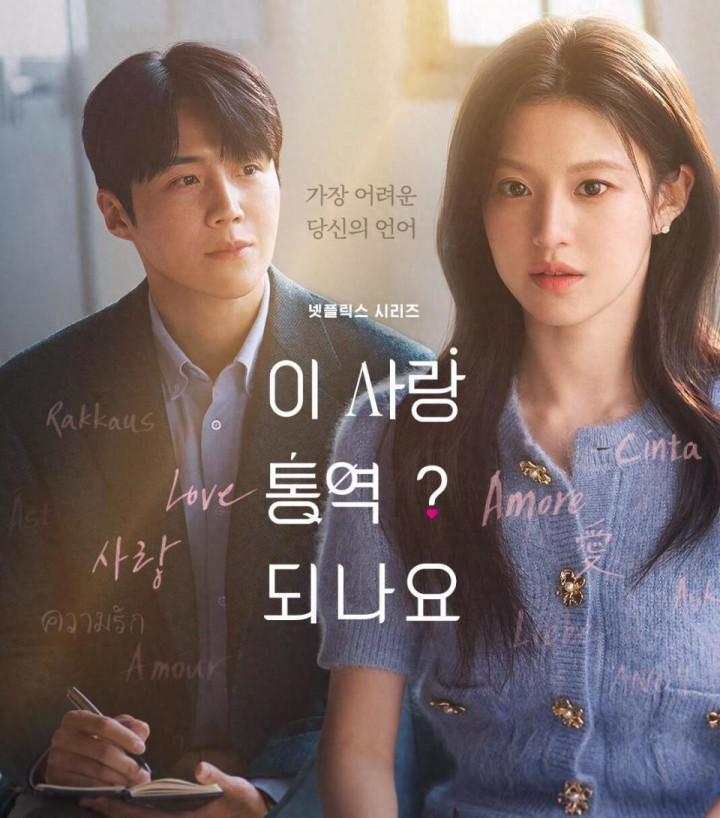 预告海报中,金宣虎与高允贞背对背站立,共享一副耳机。 背景是用多种语言书写的“Love”字样,暗示两人从语言错位到心灵相通的过程。