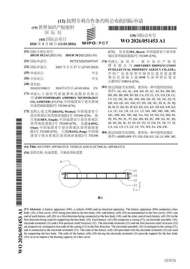 证券之星消息,根据企查查数据显示宁德时代(300750)公布了一项国际专利申请,专利名为“电池装置、车辆及用电装置”,专利申请号为PCT/CN2025/097547,国际公布日为2026年3月12日。